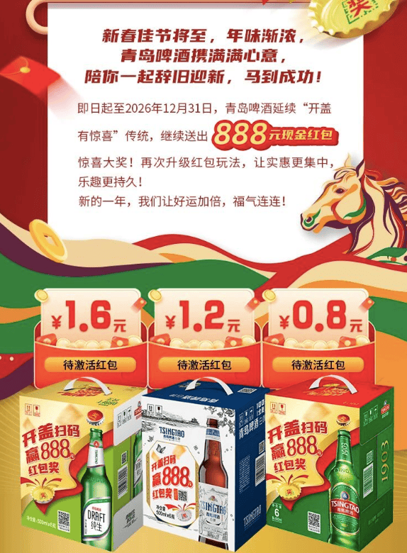 勾当笼盖洋河旗下多款焦点产物,消费者开瓶扫码可100%获得现金红包,同时无机会抽取马年定制礼物、高端酒品;针对终端门店,推出扫码核销返利勾当,门店扫描箱码核销、陈列扫码可获现金返利取陈列励,核销积极性。借帮终端核销系统,及时统计门店核销、动销数据,品牌可精准控制终端库存取动销节拍,及时调整供货取激励政策,实现终端渠道数字化管控;同时通过扫码指导注册会员,沉淀私域用户,后续通过会员专属勾当提拔粘性取复购率。青岛啤酒紧扣马年生肖文化取春节家庭、伴侣场景,推出马年春节专属包拆,将一物一码做为毗连品牌文化取消费者的焦点载体,实现文化营销取数字化营销深度融合。每款马年专属啤酒瓶身印有带生肖元素的独一二维码,消费者扫码可领取现金红包、生肖礼盒,同时可查看生肖文化解读、品牌春节公益勾当,实现“扫码得福利、扫码懂文化”。勾当联动线下商超、便当店,推出陈列扫码激励,鞭策产物终端。