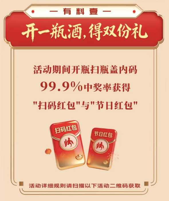 通过社交分享数据逃踪功能,及时统计分享量、点击量,精准阐发径取用户参取行为,实现结果数字化管控。勾当无需巨额告白投入,仅通过一瓶一码的简单设想,撬动全平易近参取热情,让消费者自动成为品牌载体。酒水行业是春节营销焦点赛道,聚焦宴席、礼物两大场景,马年CNY物码营销沉点处理终端动销、渠道窜货、宴席引流三大痛点,依托一物一码实现“开瓶扫码(消费者)+箱码核销(渠道)+宴席报备(终端)”数字化联动,兼顾消费者激励取渠道管控,鞭策品牌从保守渠道营销向数字化全链营销转型。剑南春紧扣春节宴席焦点场景,推出“家国同春,福马临门”一物一码专项勾当,依托瓶码+盒码+箱码的三码联系关系手艺,打通品牌、渠道、消费者全链,实现宴席营销取渠道管控双沉冲破。勾当推出“一瓶十扫”模式,每瓶剑南春宴席用酒可支撑十位宾客同时扫码抽,品涵盖现金红包、专属礼物,既提拔宴席趣味性,也扩大勾当笼盖面;同时搭建消费者、门店、导购分利机制,通过数字化分利激发终端渠道积极性。